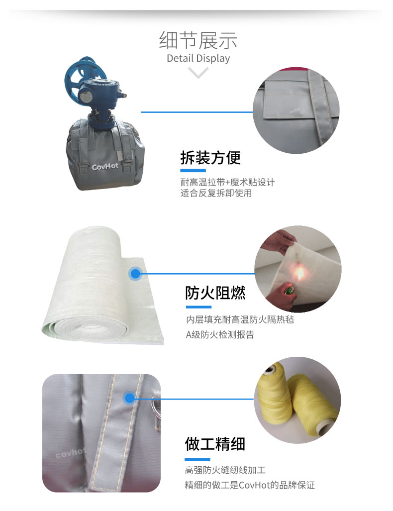 可拆卸蝶阀阀门保温套也广泛应用于石油化工,化学工程,纺丝,冶金,电力,建筑,窑炉,造纸,制药,船舶等领域的热力设备和各种管道,暖通空调及制冷装置。它适用于各种阀门管道,设备绝热保温,是理想的管道及设备保温材料!