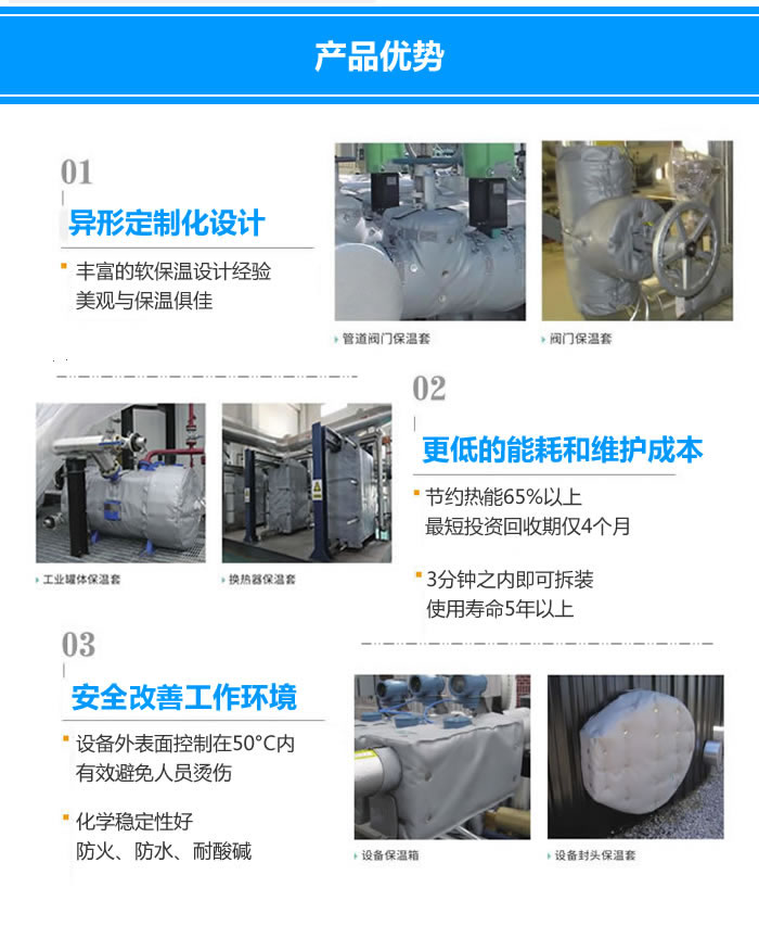 可拆卸截止阀保温套可以满足不同领域的柔性保温应用需求。可以很方便进行拆装操作,可重复多次使用,以最大化其经济效益,降低热损耗。对于一些表面形状特殊、复杂的设备隔热(防火),柔性隔热防火)套也能显示其独特的优势。经测试计算,采用本产品后,通常可节约热能达90%以上。有些用户短投资回收期仅为6个月左右。