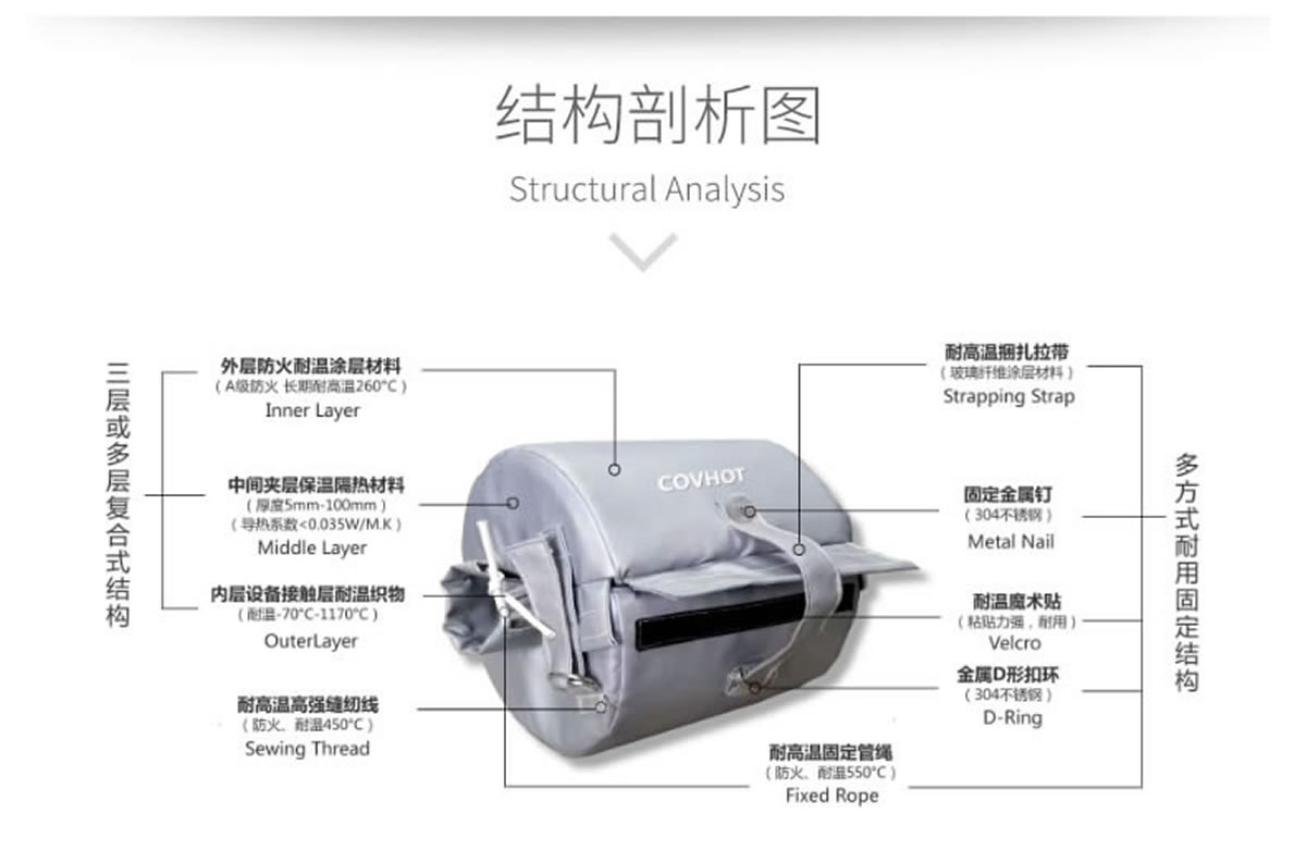 可拆式保温套保温效果好,拆装方便,易于日常维护保养,能反复使用,对环境无污染,与人体接触后不刺激皮肤。根据现场的物料产生火灾的可能性、火灾的预期温度、救火需要的时间等综合考虑,设计适应不同的温度、耐火时间,从而达到经济、合适的防火效果。
